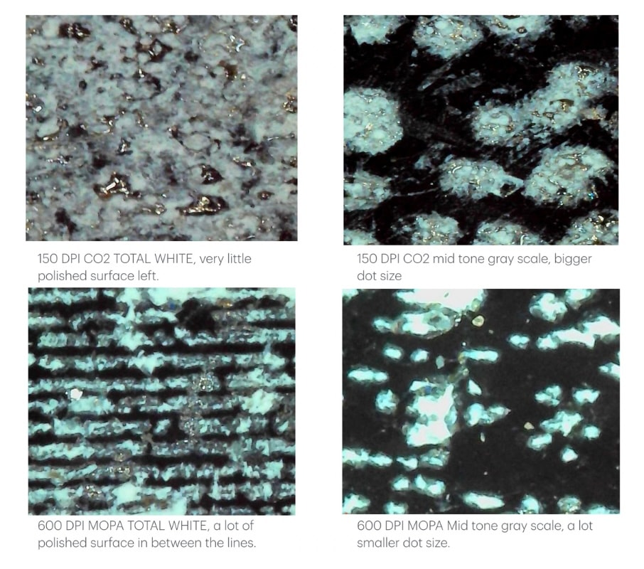 The above photo shows that a CO2 laser, even at 150 dpi when etching on quartz, removes almost all polish from granite with a total scaple. However, at 600 dpi, a MOPA fiber laser, when the pulse width and frequency are correctly set, leaves black polish behind between the lines, creating a vibrant contrast and providing much longer weathering resistance in cemeteries.